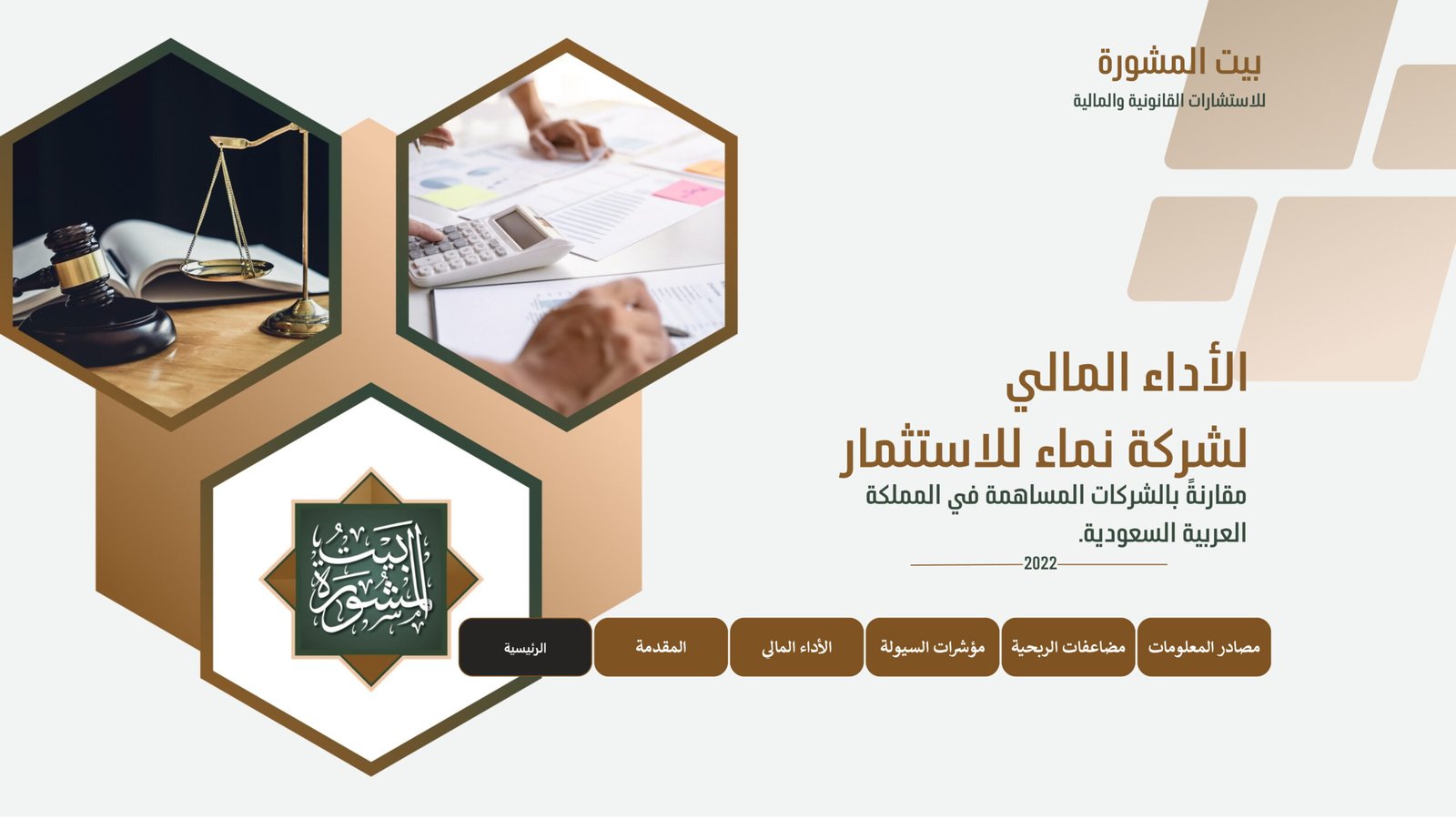 أعدَّ الفريق المالي لمكتب بيت المشورة للاستشارات القانونية والمالية هذا التقرير لمقارنة الأداء المالي لشركة نماء للاستثمار بمثيلاتها من شركات المساهَمة السعودية عن الفترة المالية 2022.